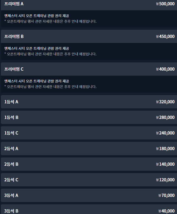 가격표는... 후덜덜한데, 사실 프리미어리그가 열리는 영국에 가서 직관을 해도 좋은 자리는 저 이상의 가격이 나오죠. 따지고 보면 더 나은 금액일 것입니다. 그리고 맨시티 오픈 트레이닝때 관람할 수 있는 권리를 제공한다고 합니다. 입장 비용이 따로 드는지 안드는지는 모르겠네요.