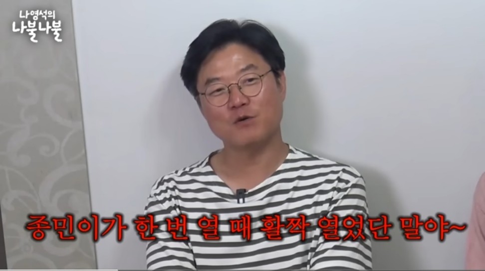 그러자 우정작가는 김종민이 평소 이성에게 마음을 잘 안 여는 성격인 것을 알고 있지만, "마음 여는 거 누나가 한번 봤는데.." 하며 슬그머니 과거 이야기 꺼냈고, 이에 질세라 나피디는 "종민이가 한번 열때 활짝 열었단 말야~"하며 너스레를 떨었다.