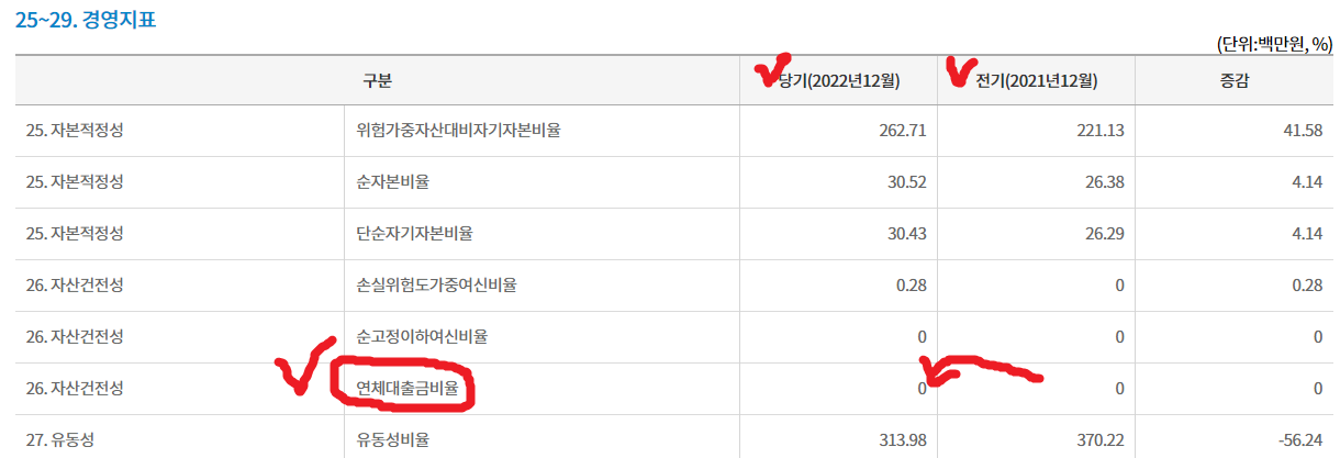 그런데 이런 26번의 자산건전성 부분 중 손실위험도가중여신비율, 순고정이하여신비율, 연체대출금비율이 증가하거나 정상이상으로 많이 잡혀있다고하면 부실을 의심해볼 수 있는 것이다.