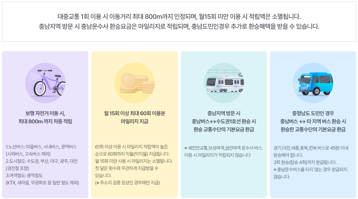 2020년 부터 국토교통부에서 시행했고, 대중교통, 걷기, 자전거 이용을 활성화하자는 취지에서 만들어졌고, 그 보상으로 마일리지를 지급한다는 제도입니다. 지금 전국적으로 확대중인데, 여러 혜택이 붙으면서 교통비를 28%정도 아낄 수 있다고 합니다.