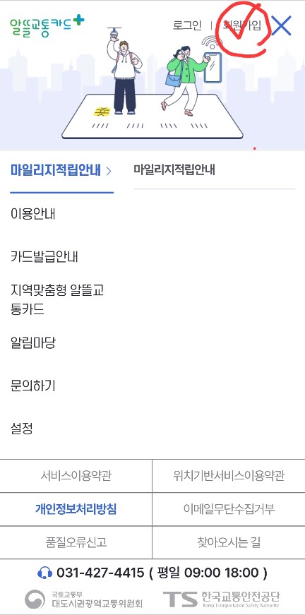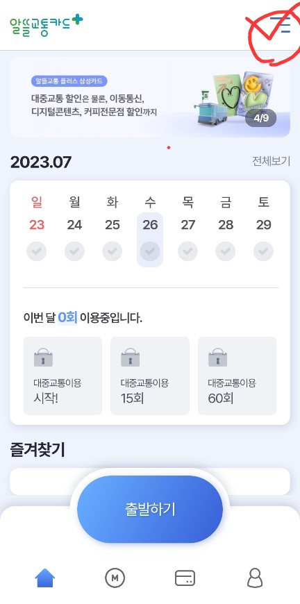 1. Play store에 "알뜰교통카드" 입력하셔서 알뜰교통카드 앱을까시면 첫화면에 아래와 같이 나옵니다. 오른쪽 상단에 세줄을 클릭하세요