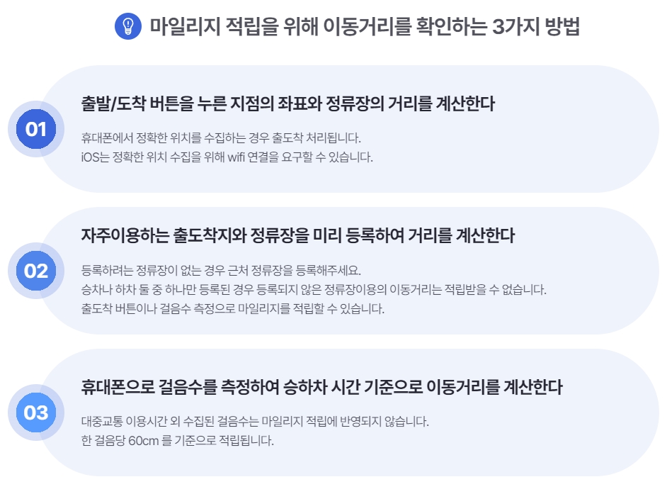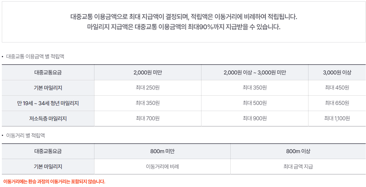 이 표에 따르면 청년, 저소득층을 제외하고는 기본 마일리지를 적립받게 될 거고, 대중교통 요금이 2000원 이상 발생하지 않는 상황, 그리고 800미터 이상 이동하는 거리라면 건당 250원씩 마일리지가 적립됩니다. 그래서 한달에 60회 이상 대중교통 이용하셨다면 15,000원까지 적립이 가능하신거죠. 나쁘지 않네요.