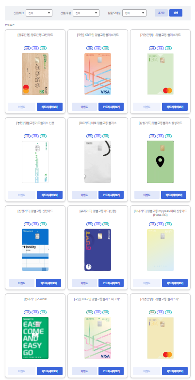 아래와 같이 알뜰 교통카드 홈페이지에 사용가능 카드들이 떠있고 비교도 가능하니 참고 바랍니다.