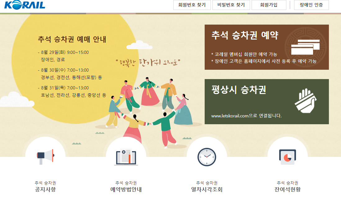 구글이나 네이버 다음에 추석 기차표 예매라고 검색하면 레츠코레일에서 명절때만 운영하는 특별 페이지로 이동하게 됩니다.