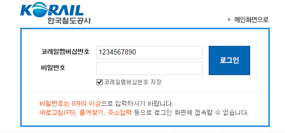 맴버번호와 비밀번호를 넣어두시고, 아래 코레일맴버쉽번호 저장을 해놓으세요.