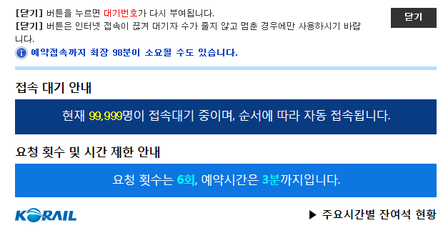 워낙 트래픽이 많이 몰리다보니, 접속대기하다가 중간에 오류가 날 수도 있습니다만, 되도록이면 클릭질 하지마시고 가만히 지켜보시는게 좋습니다. 오류가 나면 그해 명절은 망했다고 보시면 되고, 다시 들어갔을때 대기자가 4만명을 넘기게 되시면 미련을 갖지 마시고 고속버스어플로 넘어가시기 바랍니다.