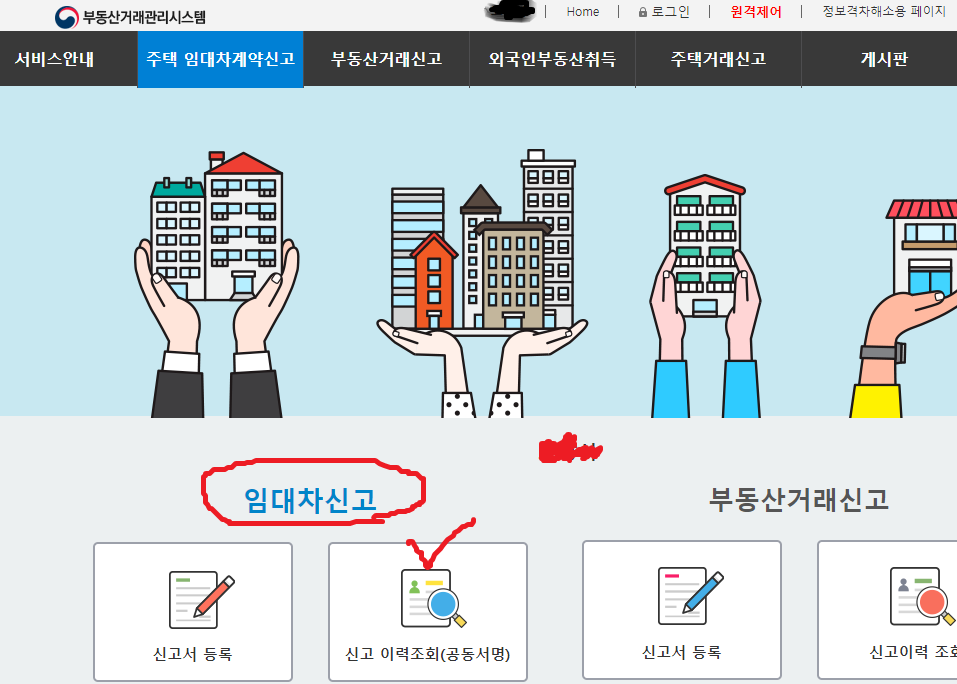 9) 첫화면에 지역을 입력하고 "신고하기" 들어가면 "주택 임대차 계약신고" 화면에서 중간에 "임대차 신고" - "신고이력조회"를 클릭하세요. 그러면 로그인을 해야하는데, 이때는 안타깝지만 공인인증서가 필요합니다.