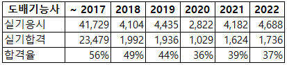 밑에 표에서 보다시피 보통 도배기능사 역대 합격율이 35-40%수준인데.. 10프로 대 합격율이 무슨말인가?