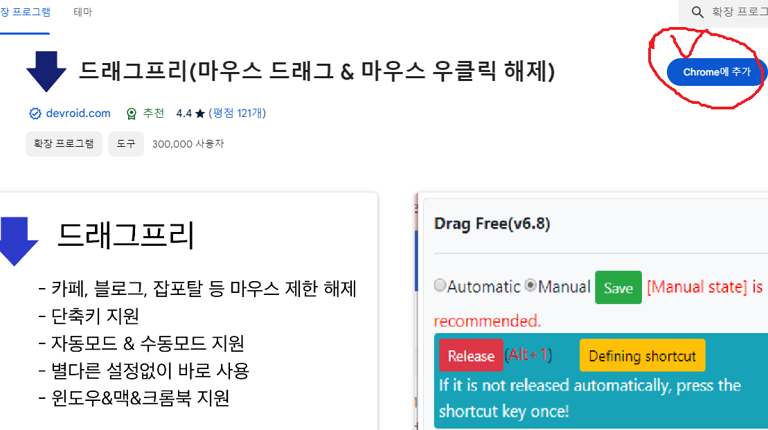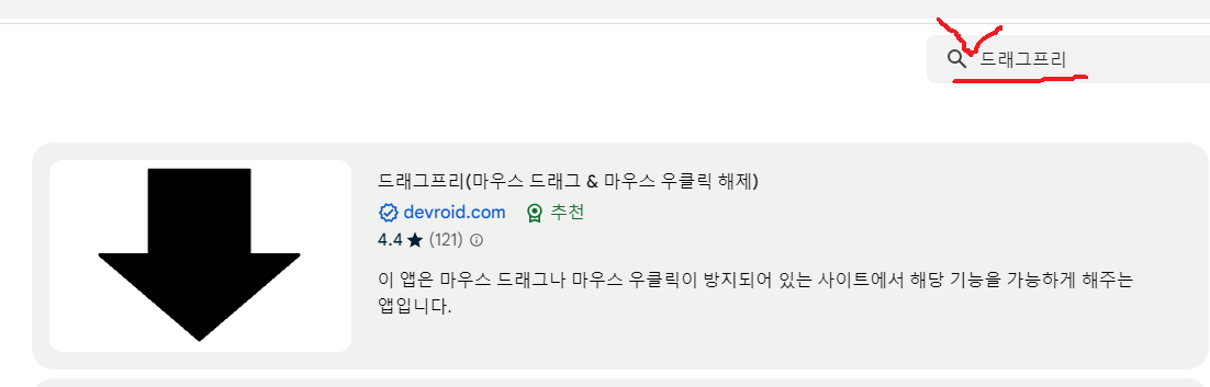 3. 확장프로그램 창 안에 검색창에 "드래그프리" 라고 검색하시면 보시는 것 처럼 제일 위에 뜹니다. 클릭하세요.
