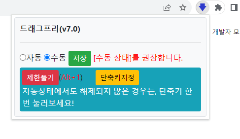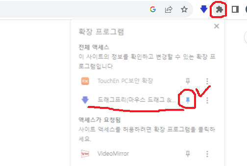 6. 그러면 확장프로그램 내역이 나오는데, 보시는 것 처럼 드래그프리 옆에 압정모양을 클릭해서 파란색으로 바꾸세요.