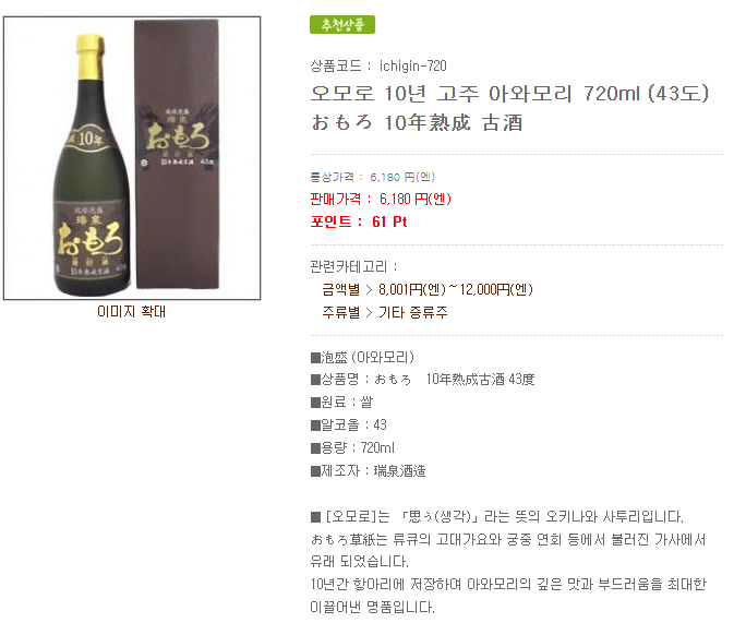 저 큰 항아리에 든 술이 얼마인지는 잘 모르겠다. 그러나 일본 사케 전문몰에서 병에 든 720ML 짜리 수리 6180엔 정도에 팔고 있는것을 확인할 수 있었다.