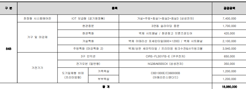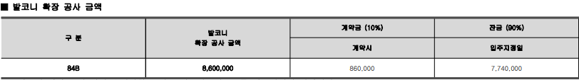 또한 발코니 확장하고 여러 가전기기 에어컨, 가구등을 한꺼번에 하시려면 2800만원 정도 비용이 드시는데, 이거는 계약시에 10프로 정도 선납하시고 입주때 90프로 납부하시면 되겠습니다.
