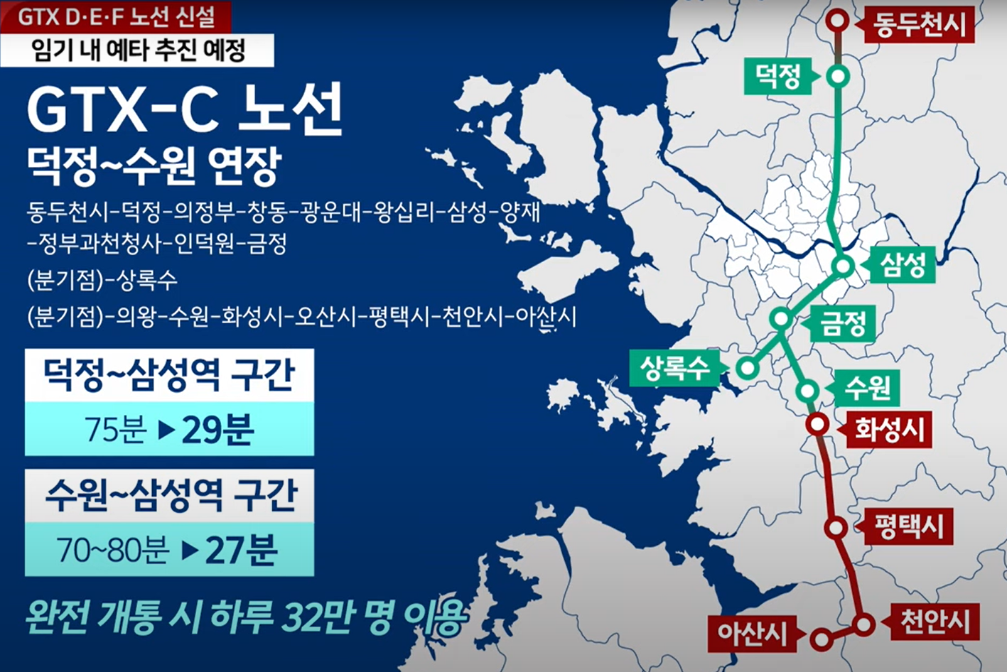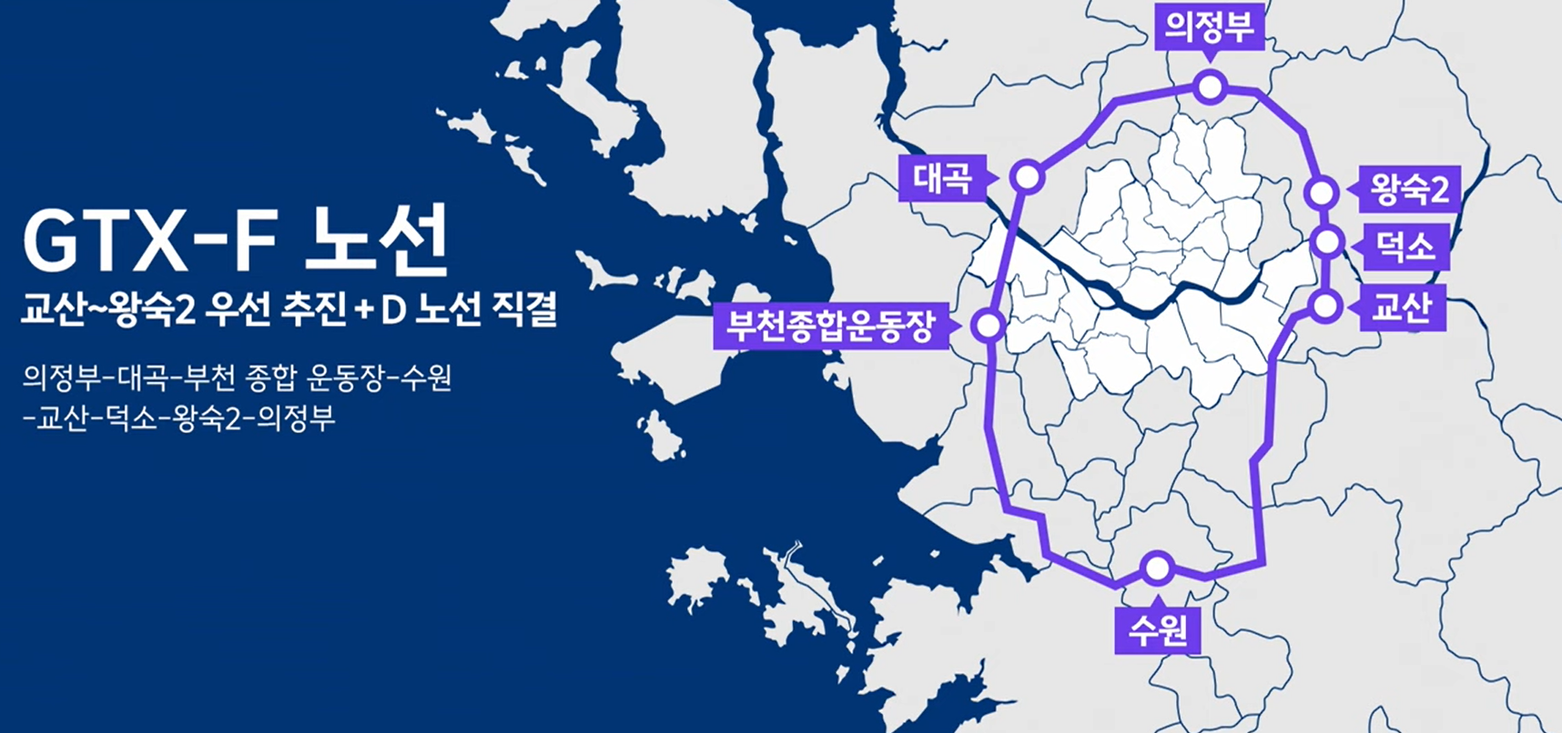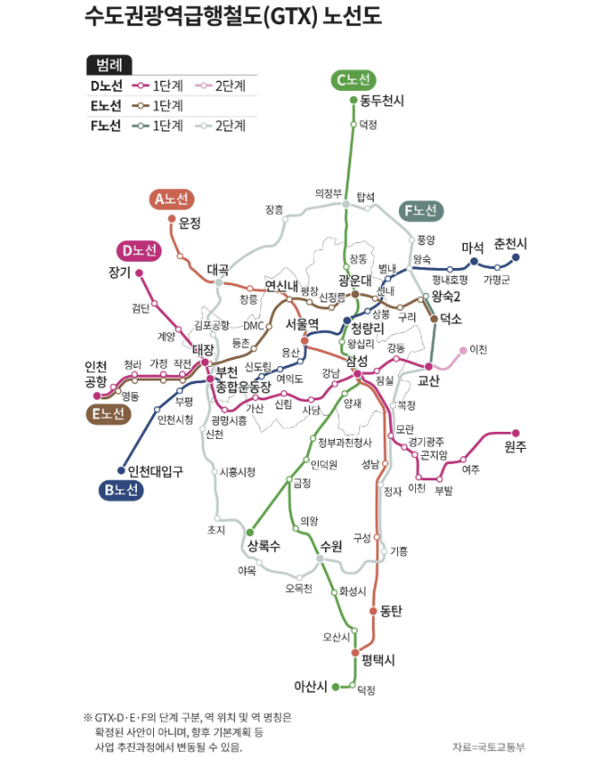 이번 발표는 기존 GTX A,B,C 노선의 연장선과 신규 D, E, F 노선의 신설 발표입니다.