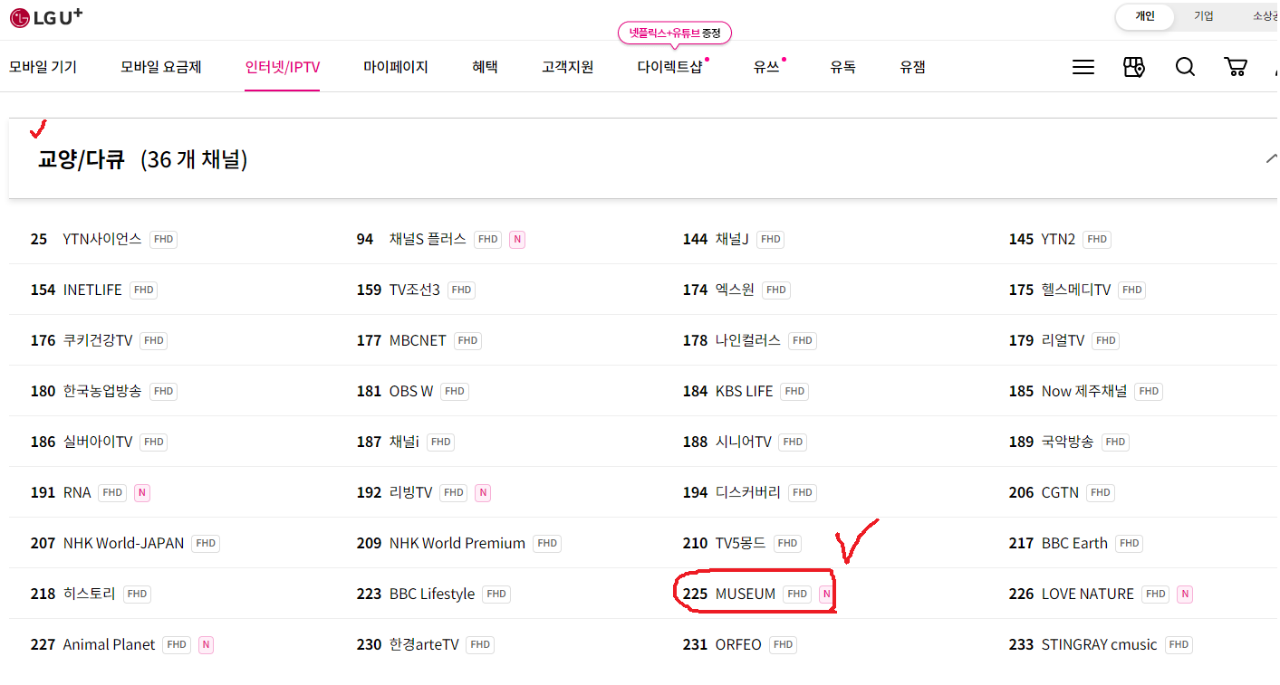 LG U플러스는 가격별로 볼수 있는 채널이 다른데, 기본 베이직에서는 뮤지엄TV를 서비스하지 않습니다.