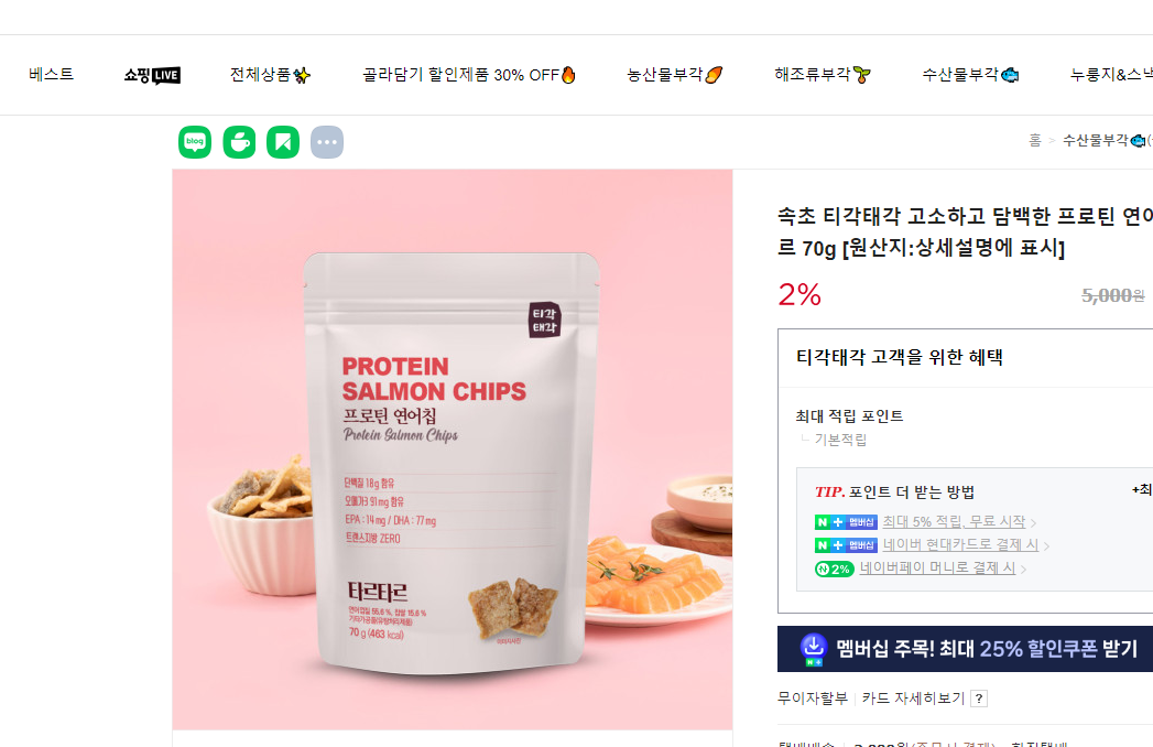 티각태각에서 판매하는 프로틴 연어칩 타르타르 속초 티각태각입니다.