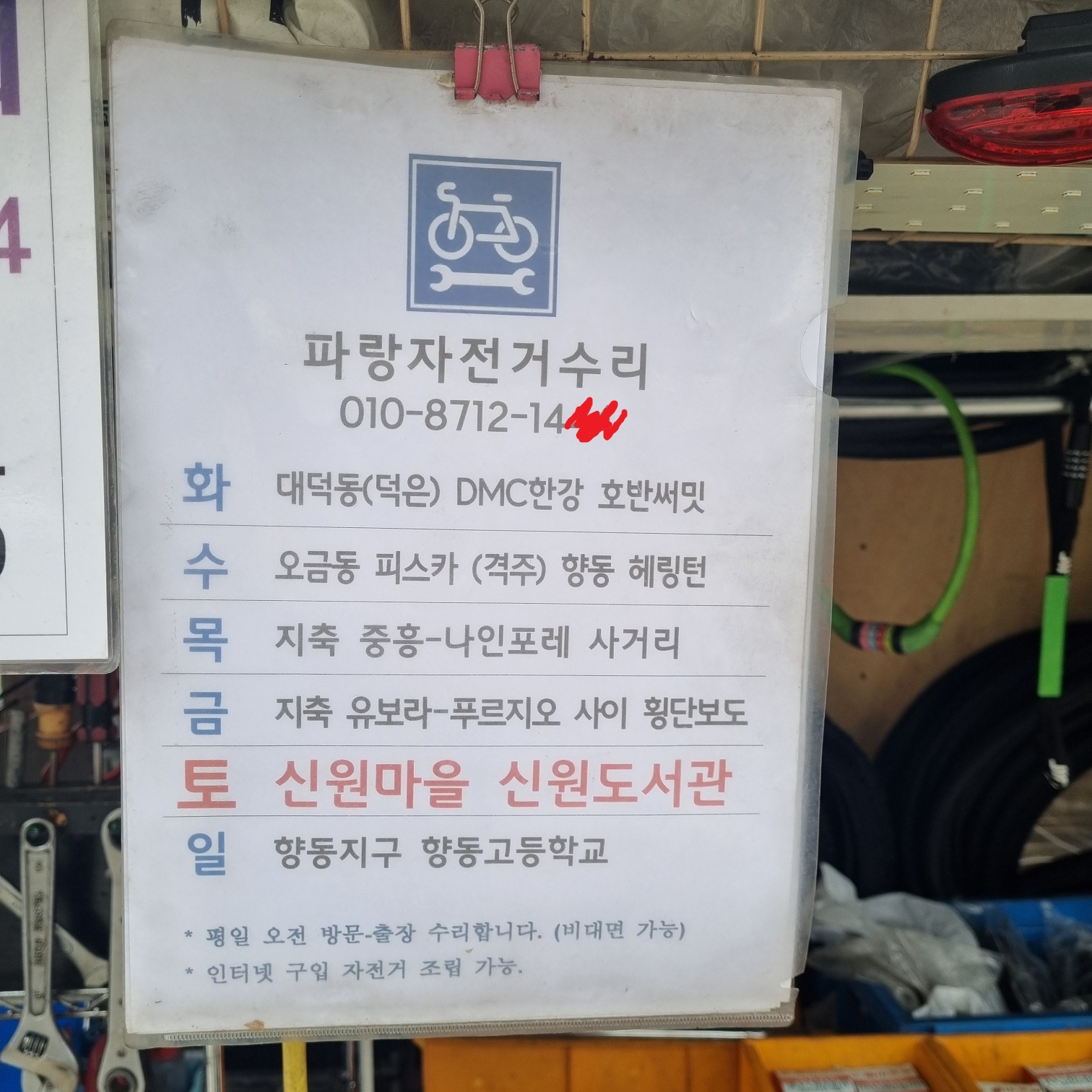 쓰여진대로 평일 오전에는 방문 수리도 가능하시다고 합니다. 그리고 인터넷에서 구입하신 자전거 조립도 힘드시죠? 그것도 대신 해주신다네요.