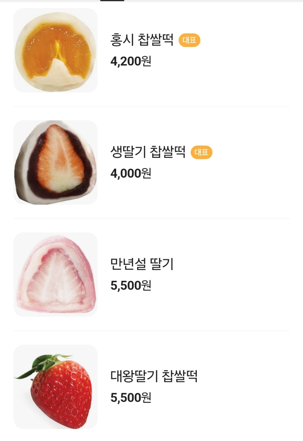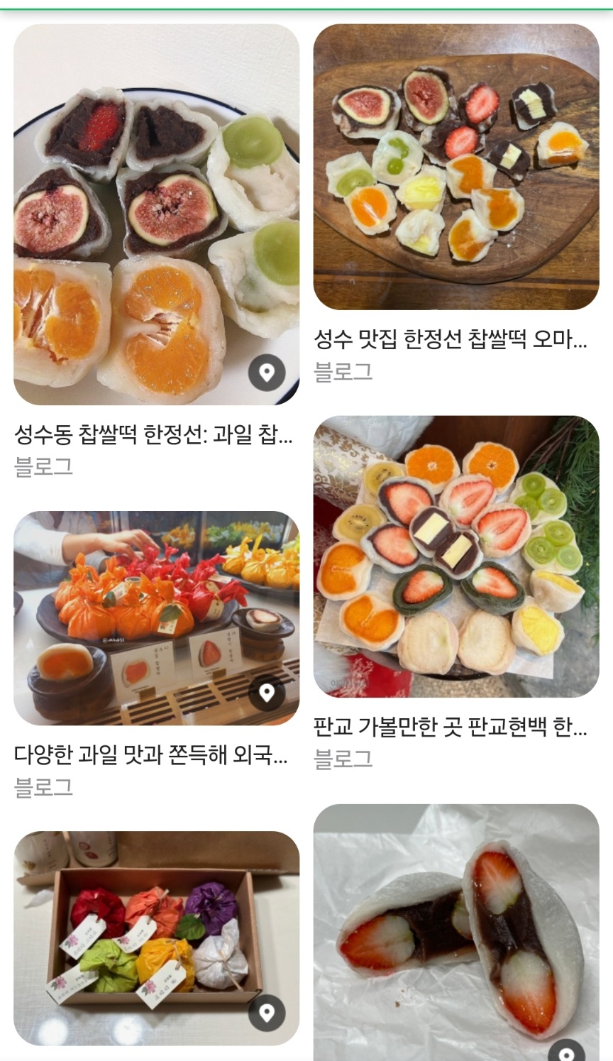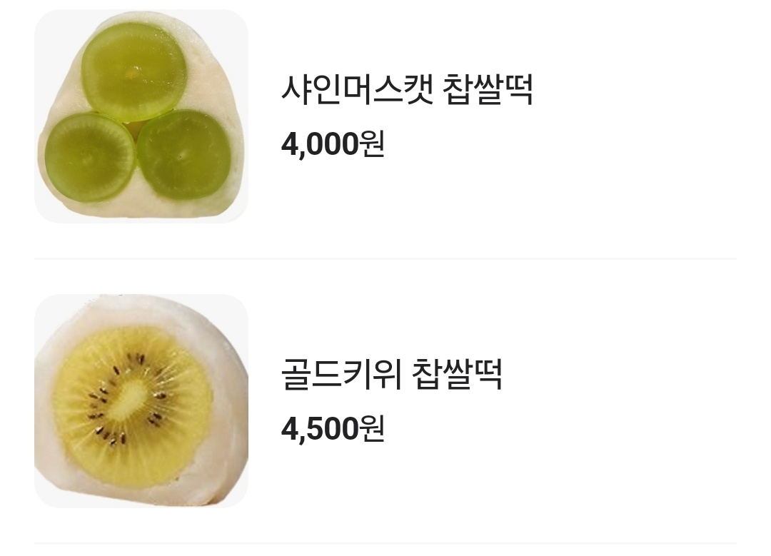 먼저 소개된 디저트는 통과일 찹살떡인데요. 성수에서 이미 유명힌 한정선 찹살떡입니다. 신세계 강남에도 입점해 있지만 본점에 가셔도 드실 수 있습니다. 가격은 4-5000원대이네요. 요새 물가가 많이 올라서 그런지 그렇게 비싸기 느껴지지 않네요.