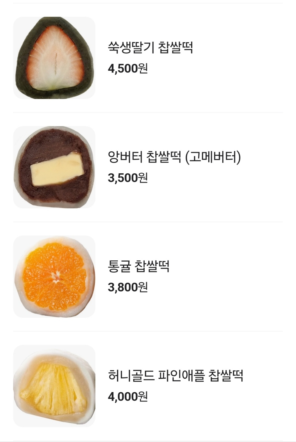 먼저 소개된 디저트는 통과일 찹살떡인데요. 성수에서 이미 유명힌 한정선 찹살떡입니다. 신세계 강남에도 입점해 있지만 본점에 가셔도 드실 수 있습니다. 가격은 4-5000원대이네요. 요새 물가가 많이 올라서 그런지 그렇게 비싸기 느껴지지 않네요.