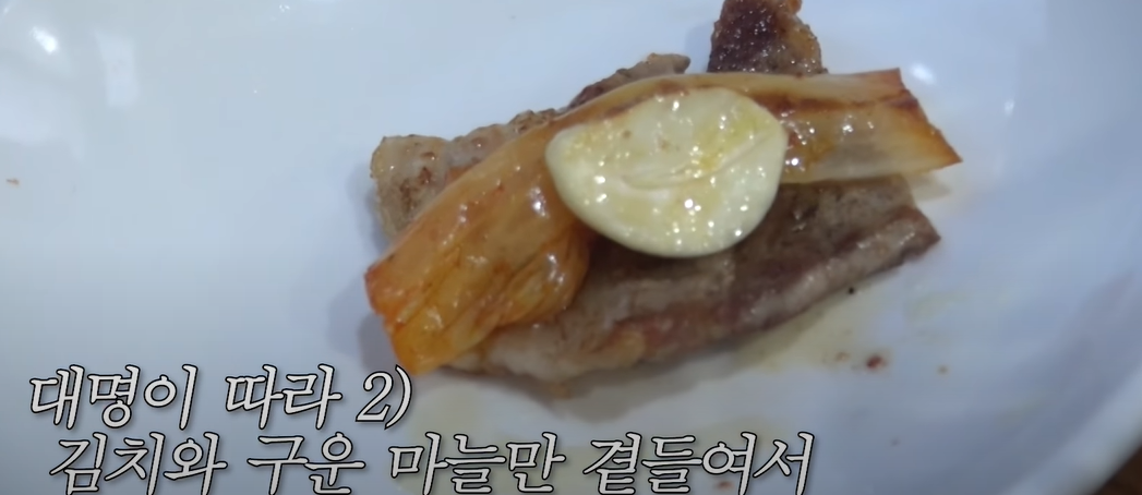 두번째는 고기위에 구운김치와 마늘을 곁들여서 먹는 겁니다.