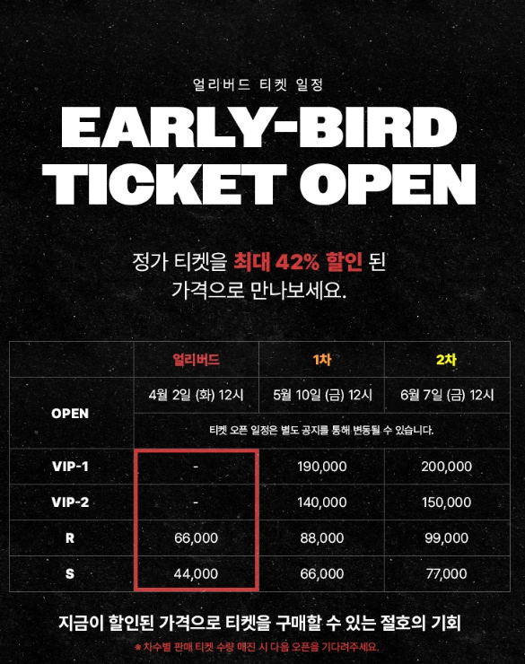 이번 4월 2일 얼리버드에서는 VIP 1-2 석은 아직이구요. R과 S석만 오픈됩니다.
