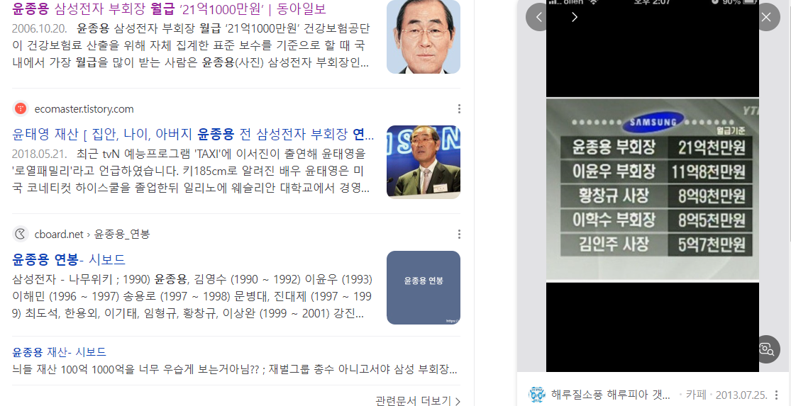 2006년 보도에 따르면 윤종용은 대한민국 월급쟁이로써는 연봉 1위를 기록했는데요. 기사에는 윤종용씨가 21억 1000만원을 받는다고 적혀있는데, 그게 연봉이 아니라 월급이라고 공개되면서 충격을 줬었습니다.