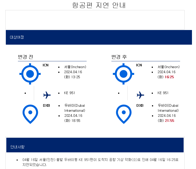 2024년 4월 16일 13시 25분에 인천을 출발하려고 예정되었던 대한항공 KE 951 편이 어제 오전 9시경 급하게 공지를 돌려서 3시간 가량 출발이 지연된 바 있습니다. 원인은 도착지 공항 기상 악화였습니다. 이미 그때도 날씨 때문에 착륙이 어려울 것이라는 판단이 있었던 것 같습니다.