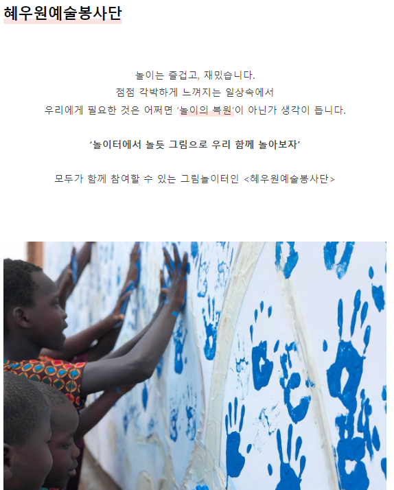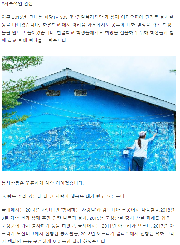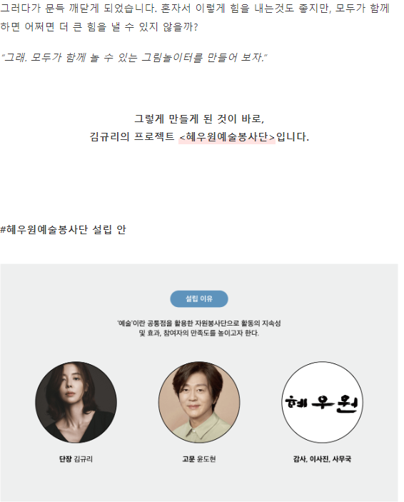 그러면서 그녀가 최근에 활동하고 있는 봉사단체인 혜우원 예술봉사단의 활동을 소개했습니다. 삭막한 세상가운데 어린이들에게 아름다운 세상을 선물하고 싶다는 의지에서 출발한 봉사단이라고 합니다. 예술인들이 함께모여서 벽화를 그리는 작업을 하고, 그 비용을 펀딩하기 위해서 텀블벅에 펀딩을 걸었고 이제 8일 정도 남았다고 합니다.