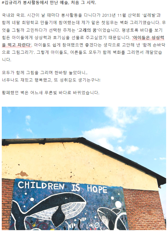 그러면서 그녀가 최근에 활동하고 있는 봉사단체인 혜우원 예술봉사단의 활동을 소개했습니다. 삭막한 세상가운데 어린이들에게 아름다운 세상을 선물하고 싶다는 의지에서 출발한 봉사단이라고 합니다. 예술인들이 함께모여서 벽화를 그리는 작업을 하고, 그 비용을 펀딩하기 위해서 텀블벅에 펀딩을 걸었고 이제 8일 정도 남았다고 합니다.
