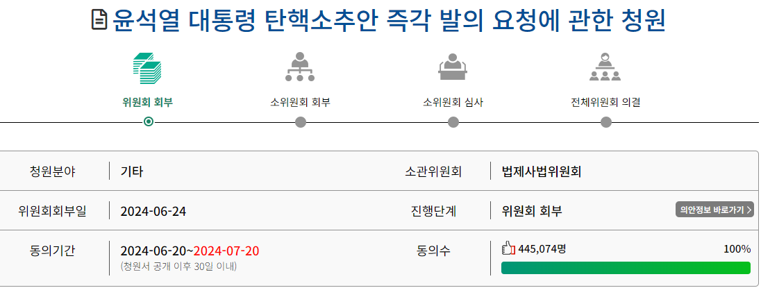 대한민국 국회에 국민동의청원 코너가 있는데, 윤석열 대통령 탄핵소추안을 즉각 발의하도록 청원하는 방법이 생겼습니다. 이미 45만명 가까이 청원에 참여하고 계십니다 ㅎㄷㄷㄷ