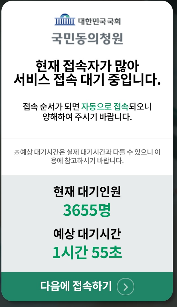 이윽고 접속하였을때는 이상하게도 청원사이트의 해당 페이지로 자동접속되던것과는 달리, 메인 페이지로 연결되었고, 아래의 공지문이 떴다.