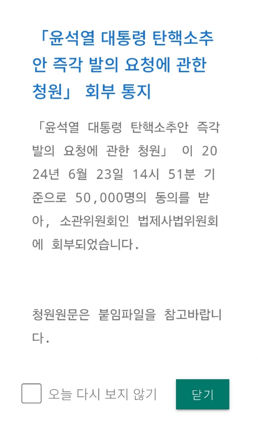 여러 기사에서 보도된 바 있는 윤석열 대통령 탄핵 소추 즉각발의 요청에 관한 청원이 예정과 다르게 갑자기 종료되었다.