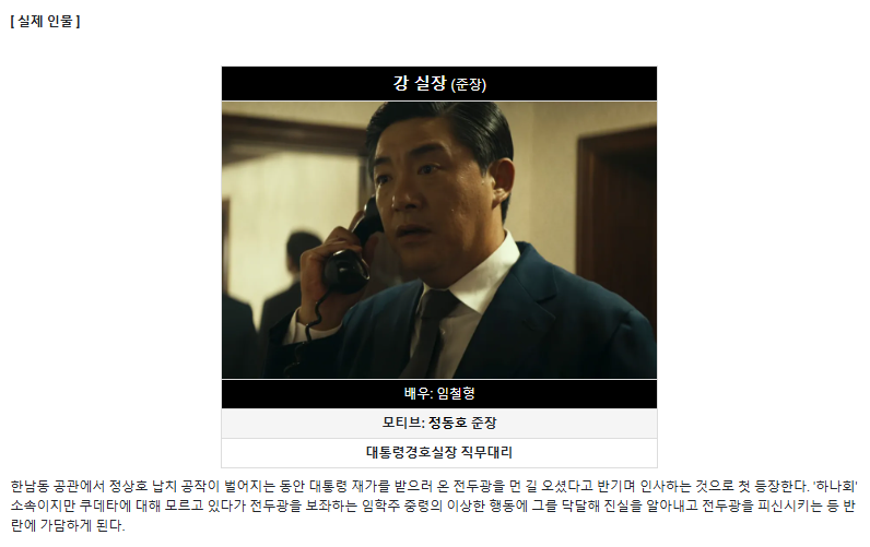 조한창 헌법재판소 재판관의 장인이 정동호인데, 그가 바로 서울의 봄에서 임철형 배우가 분했던 강실장 역의 정동호 준장이라고 합니다. 영화에서는 하나회 맴버 중 하나로서 대통령 공관에서 최규하 대통령의 경호실장 직무대리를 맡고 있는 인물입니다. (차지철이 경호실장이었는데, 그가 죽은 뒤 정동호가 경호실장 직무대리가 된거죠)