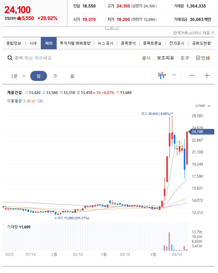 계룡건설, 오늘 상한가! 이유가 뭘까? (2025년 4월 18일 기준)