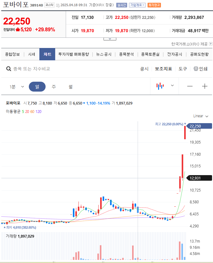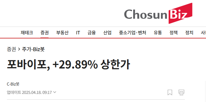 오늘(2025년 4월 18일) 주식시장에서 **포바이포(389140)**가 상한가를 찍으면서 많은 분들이 "이거 무슨 호재야?!" 하셨을 텐데요.