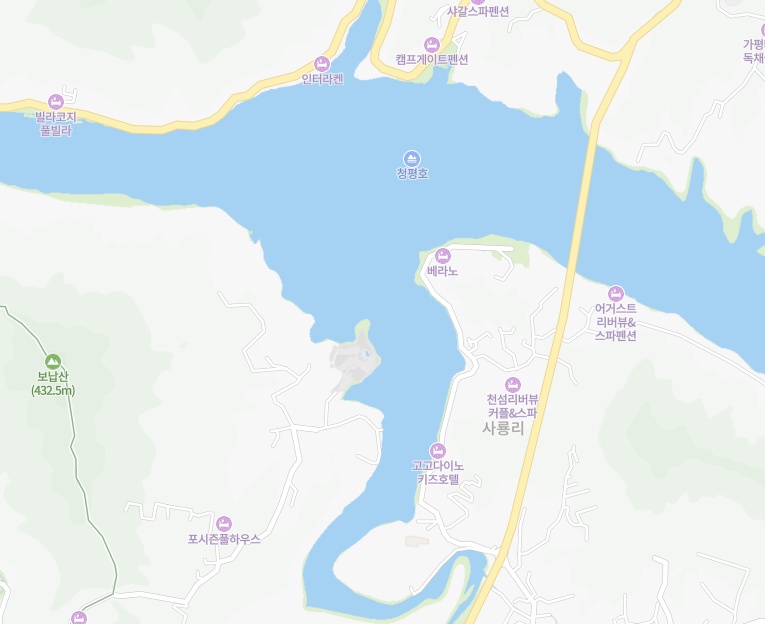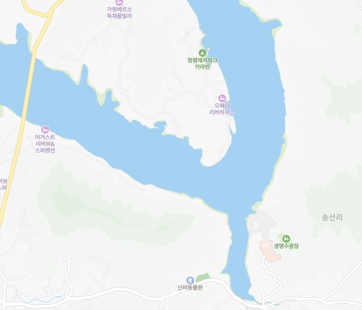 의심가는 동네는 가평군이고요. 평자가 더 들어간다고 하면 청평면도 의심이 되네요. 그중에서도 요트 정박시설이 많고 강변, 호수변에 요트 정박장이 잘 설치되어 있는 고급빌라, 별장이 모여있는곳은 아래와 같습니다.
