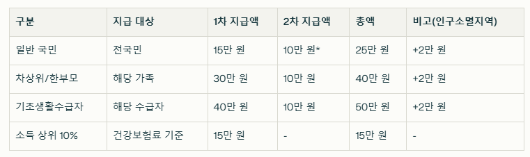 - 2차 지급(추가): 소득 하위 90%만 1인당 10만 원(8월 중순 예정)