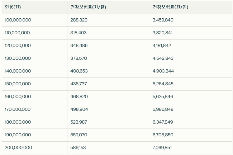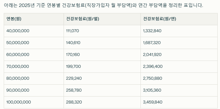 아래는 2025년 기준 연봉별 건강보험료(직장가입자 월 부담액)와 연간 부담액을 정리한 표입니다.