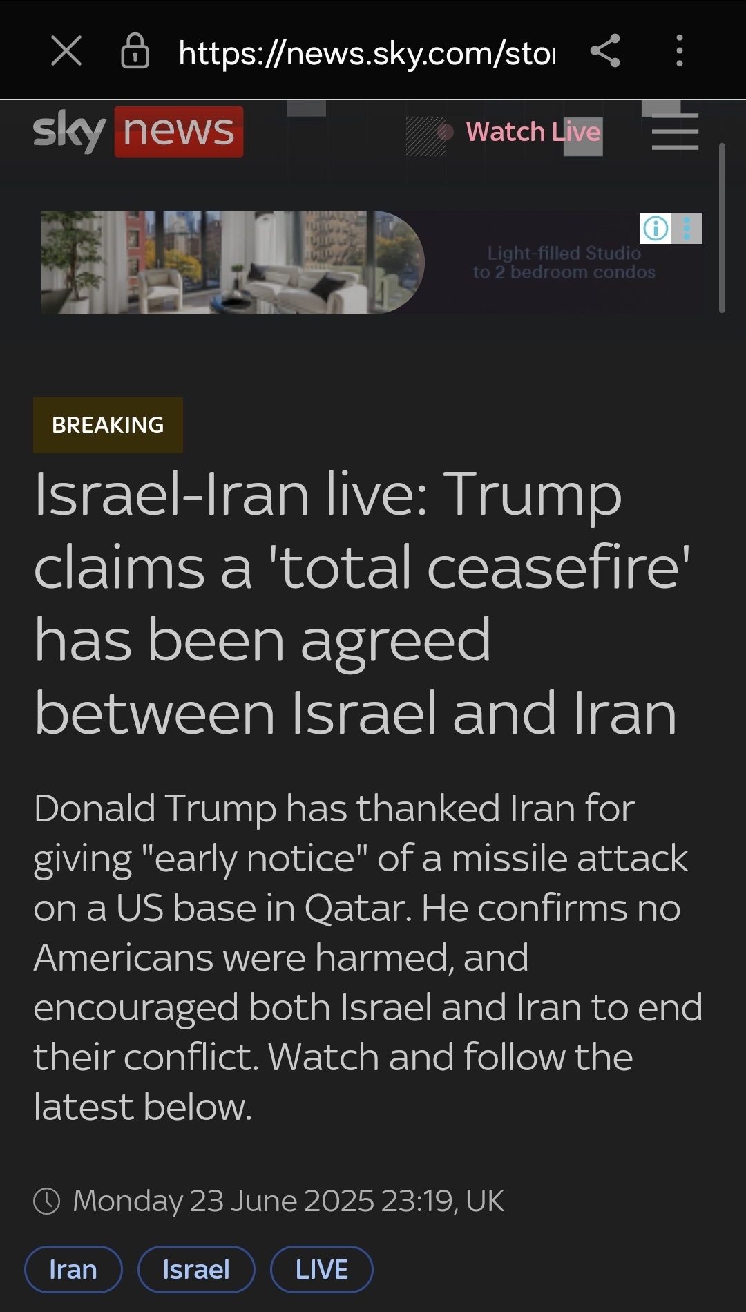 최근 도널드 트럼프 전 미국 대통령이 이스라엘과 이란의 완전 휴전(ceasefire) 합의를 공식 발표했습니다. 그러나 이란 정부는 공식적으로 이를 부인하고 있습니다. 이번 휴전 합의 발표와 관련된 최신 상황과 주요 내용을 전달드립니다.