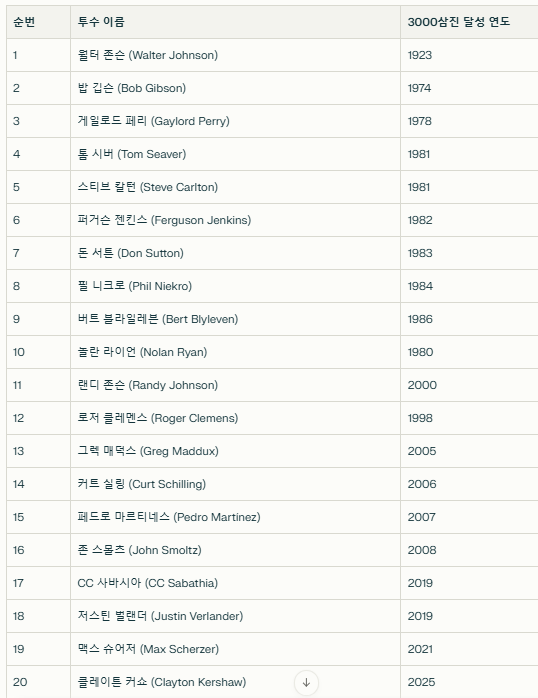 메이저리그는 150년이 넘는 역사를 가진 리그입니다. 그 오랜 시간 동안 수많은 투수들이 마운드에 올랐지만, 2025년 현재 3000삼진을 달성한 투수는 단 20명뿐입니다. 그만큼 이 기록은 아무나 세울 수 없는, 투수라면 평생을 바쳐도 도달하기 힘든 ‘꿈의 벽’입니다.