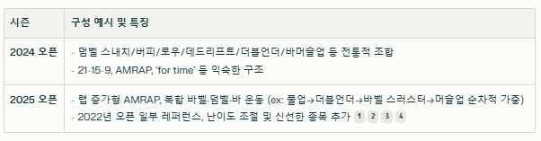 - 2024년: 크로스핏 전통적 조합+팀/페어/대형장비 사용, 비교적 예측 가능한 종목