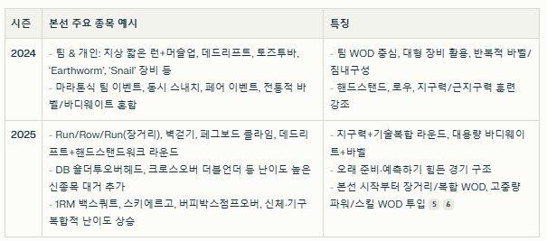 • 2024년: 크로스핏 전통적 조합+팀/페어/대형장비 사용, 비교적 예측 가능한 종목