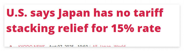 미국 백악관 관계자는 일본산 자동차 등 일부 품목에 대해 기존 관세에 15%를 추가 적용하는 방침이 맞다고 밝혔습니다. 즉, 일본 측 설명과 달리 ‘스태킹 금지(중첩 금지)’가 명확히 명시되지 않아 최종 관세는 17.5%가 되는 것으로 보도되고 있습니다. 이는 유럽연합(EU)은 예외적으로 중첩을 제한해 15% 상한을 두지만, 일본은 해당되지 않는다는 점도 분명히 언급되고 있습니다.