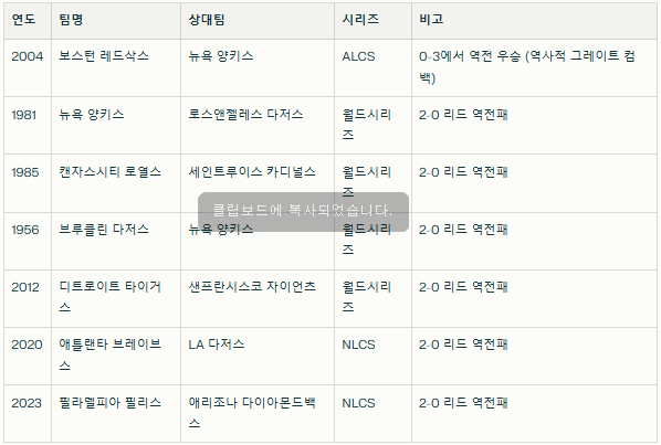 역설적이게도 2-0으로 앞섰음에도 불구하고 시리즈에서 역전당한 사례도 15번 기록되어 있습니다. 이는 전체 확률에서 드문 일이지만 야구의 극적인 매력 중 하나를 보여줍니다.