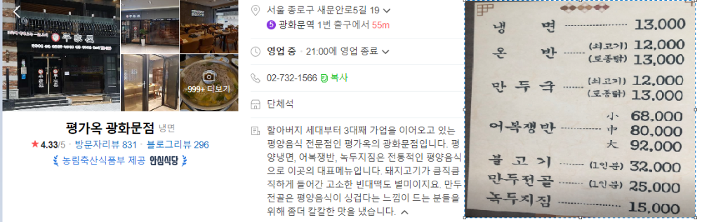 - 평양냉면, 불고기, 어복쟁반, 방은 있지만 홀 위주